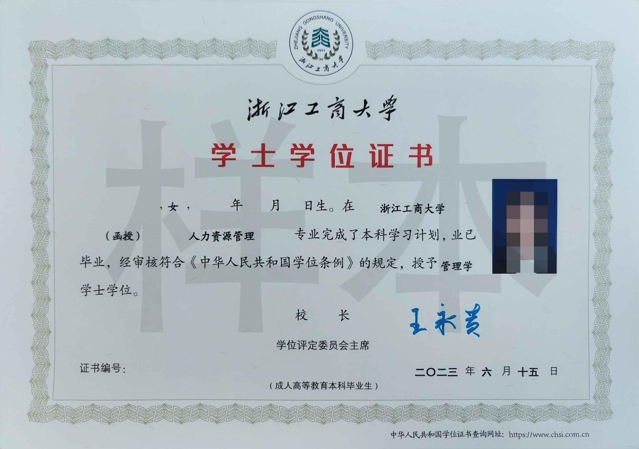 浙江工商大学学位证书样本