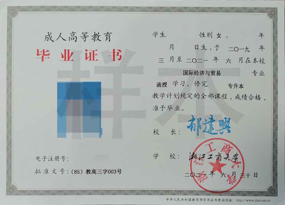 浙江工商大学毕业证书样本